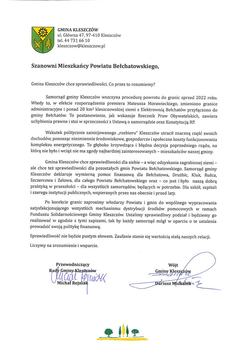 Poniżej znajduje się skan pisma skierowanego przez Wójta Gminy Kleszczów Dariusza Michałka oraz Przewodniczącego Rady Gminy Michała Rejniaka do mieszkańców powiatu bełchatowskiego:
