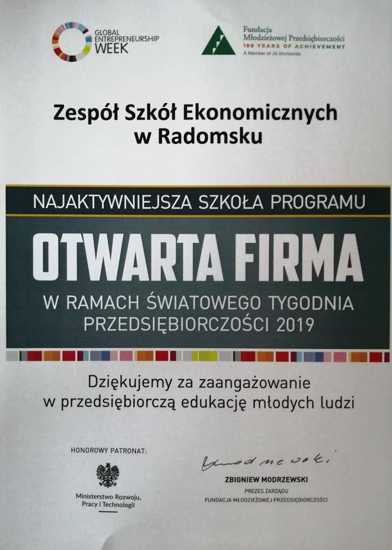 Uczestnicząc co roku w programie OTWARTA FIRMA, Zespół Szkół Ekonomicznych w Radomsku po raz kolejny otrzymał wyróżnienie i znalazł się w gronie 10 najaktywniejszych szkół ponadpodstawowych w Polsce, czego uhonorowaniem jest już piąta statuetka wręczona za poprzednią edycję.