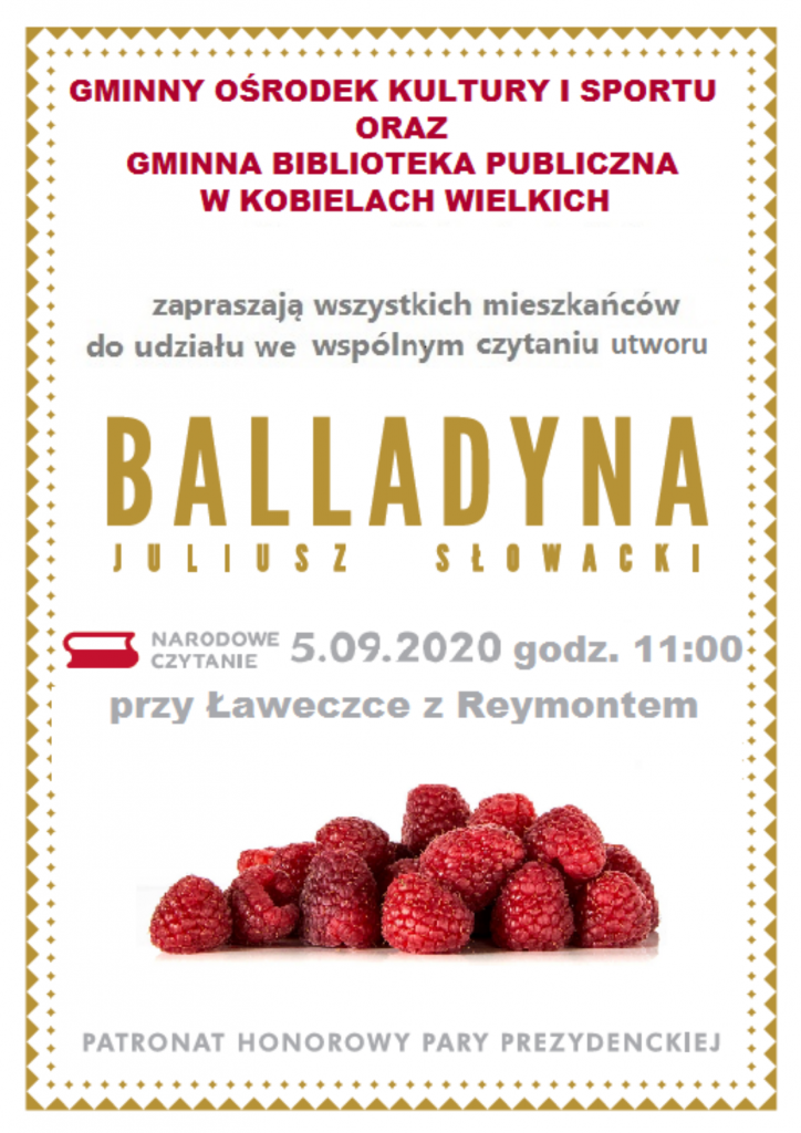 Gminny Ośrodek Kultury i Sportu oraz Gminna Biblioteka Publiczna w Kobielach Wielkich zapraszają wszystkich mieszkańców do udziału we wspólnym czytaniu utworu "Balladyna" Juliusza Słowackiego.