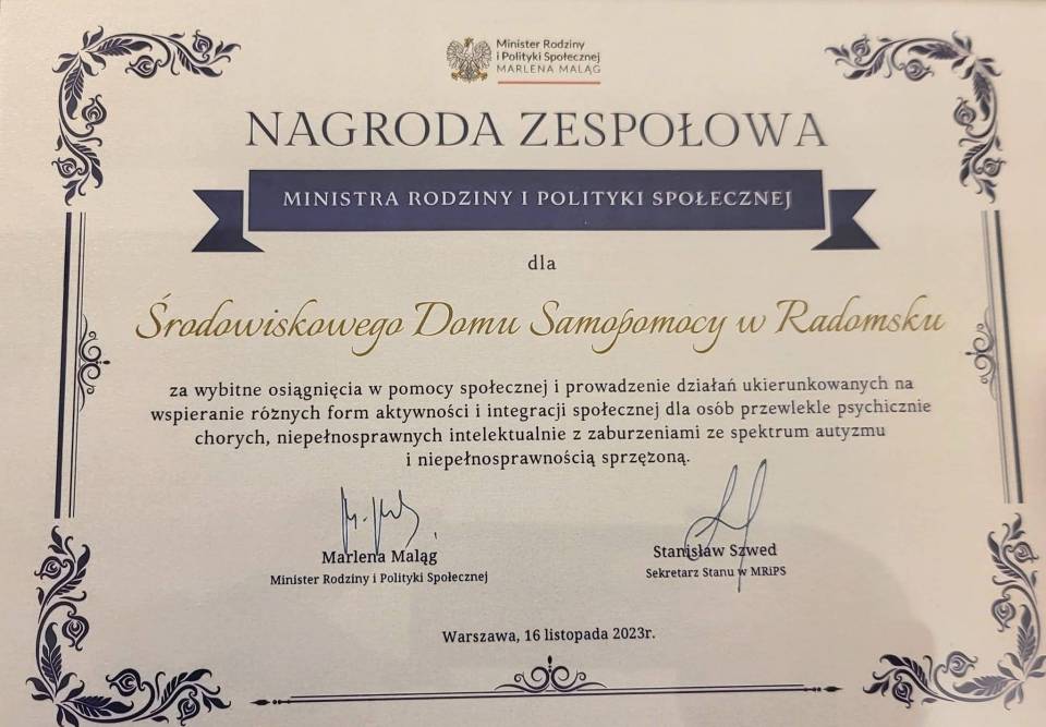 W czwartek 16 listopada w Ministerstwie Rodziny i Polityki Społecznej odbyło się spotkanie z okazji Dnia Pracownika Socjalnego, wypadającego 21 listopada. Podczas spotkania wręczono nagrody i odznaczenia za wybitne, nowatorskie rozwiązania w zakresie pomocy społecznej. Wśród wyróżnionych placówek z całej Polski, znalazł się Środowiskowy Dom Samopomocy w Radomsku.